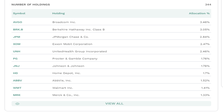 El ETF Value más grande del mercado norteamericano y lógicamente el más grande mundo es Vanguard Value ETF (VTV) con más de 120 billion$ en AUM (activos bajo gestión) y aquí aparecen las 10 primeras compañías.